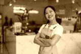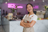 Young entrepreneur, an asian woman wearing an apron, stands proudly with crossed arms in her trendy coffee shop, embodying confidence and success in the food service industry
