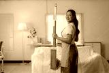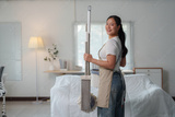 Happy housekeeper wearing an apron, holding a cleaning mop and smiling brightly while preparing to clean the home. Ready to tackle housework and maintain a tidy environment