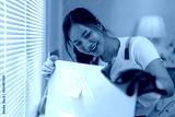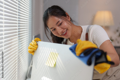 Young woman wearing yellow gloves cleaning white refrigerator door with blue microfiber cloth, smiling and looking at her work in a modern home environment