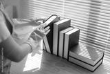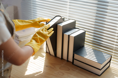 Cleaning lady wearing yellow gloves organizing books on a wooden shelf near a window with blinds, sunlight passing through the blinds creating shadows on the books and wooden surface
