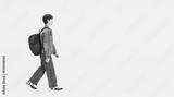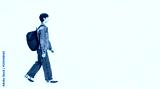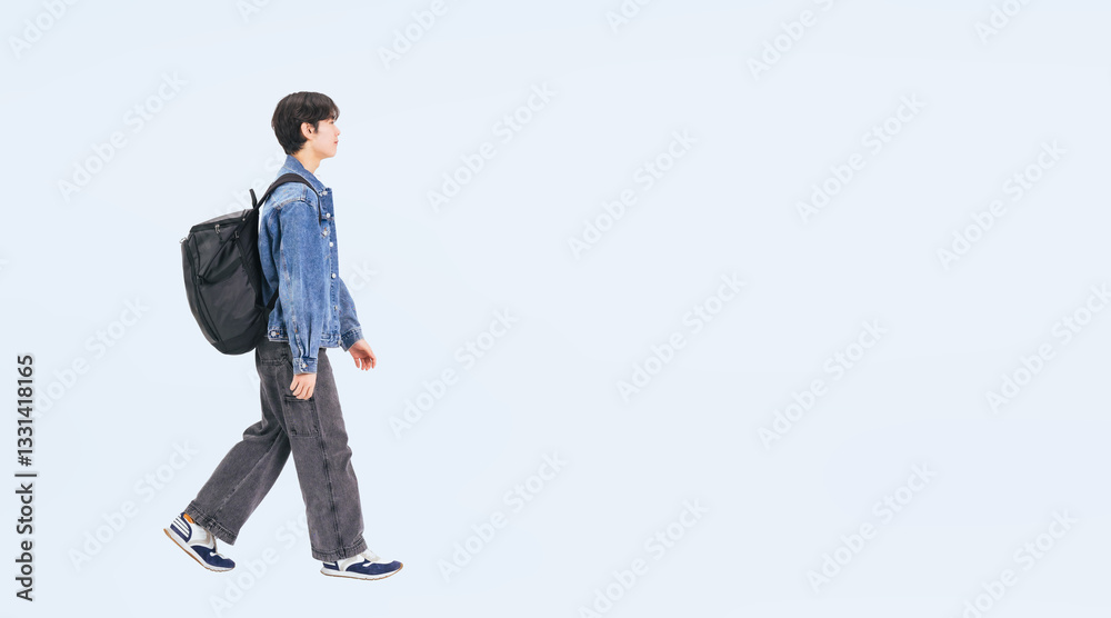 横向きに歩くカジュアルウェアの若い男性の全身写真(切り抜き背景透過PNGも販売しております。↓作成者リンクから「PNG」で検索してください)