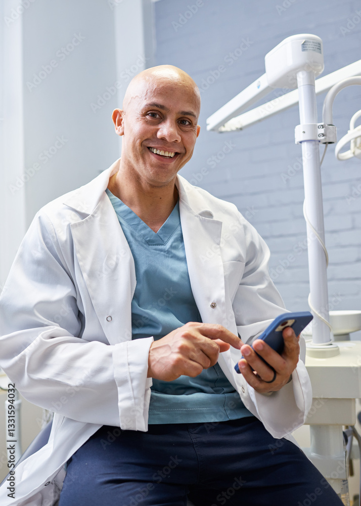 Friendly Smiling Male Dentist in a Clinic Setting Using a Smartphone