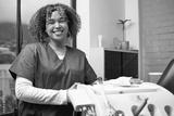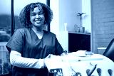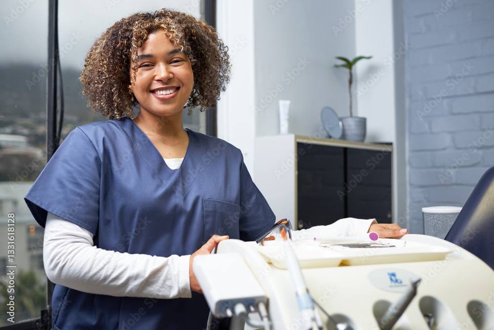 Smiling Female Healthcare Professional in Uniform Posing in a Bright, Modern Medical Office Setting