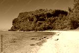 Coastal landscape cliff and beach on the shore of Rurutu island, French Polynesia, south Pacific ocean, Austral archipelago
