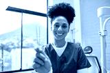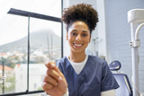 Smiling Dentist Holding Dental Instruments in a Bright and Modern Office