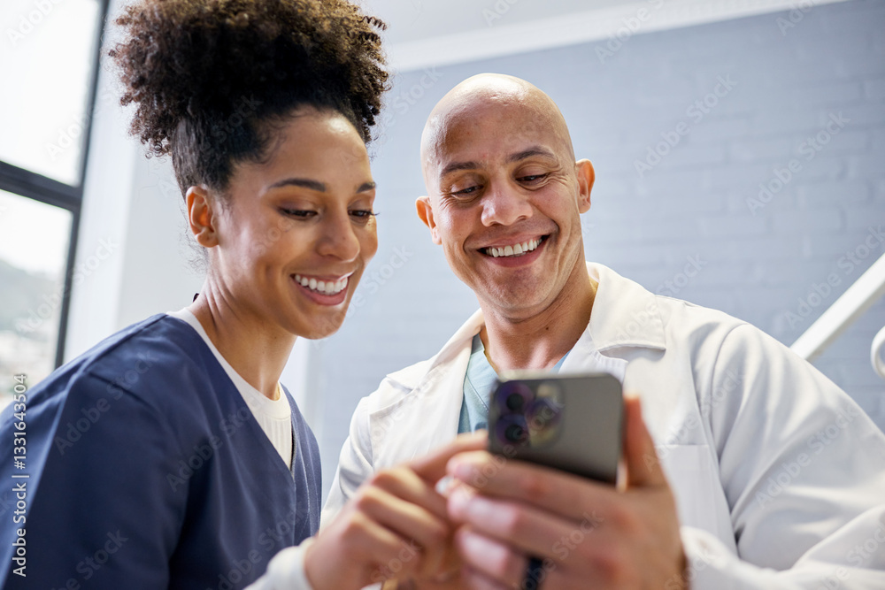 Two Medical Professionals Smiling and Sharing Information on a Smartphone