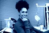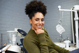 Smiling Woman Relaxing at a Dental Clinic Beside Medical Equipment
