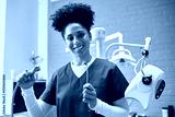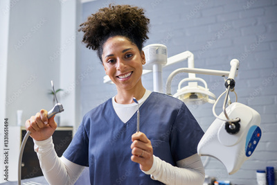 Confident Female Dentist Holding Dental Tools in a Modern Clinic
