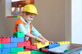 Happy boy in safety helmet plays indoors. Schoolchild building house with toy construction bricks. Safety education for children. Playful work experience for young kids.