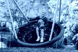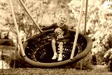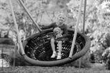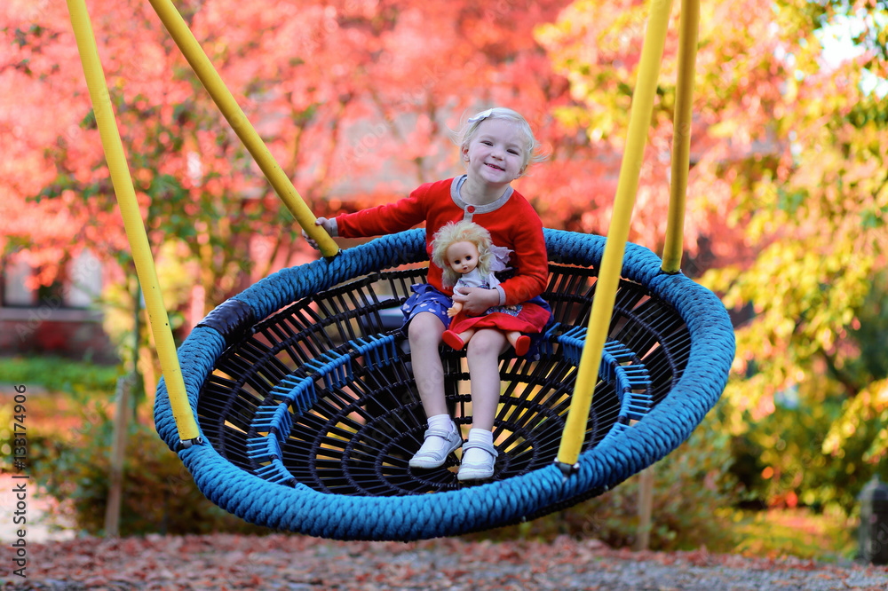 Laughing little kid having fun at playground. Cute blonde toddler girl swinging in the park. Happy children playing outdoors on sunny autumn day.