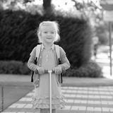 Happy toddler kid with small backpack going to school. Preschooler girl safely riding scooter crossing road on zebra pad. Happy cute little child wearing bright pink dress enjoying sunny day outdoors.