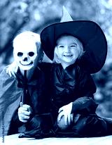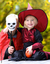 Portrait of little girl in Halloween witch costume and her teenage devil brother holding pumpkin and skull decoration