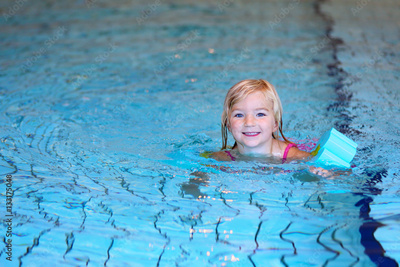 Happy preschooler girl learning to swim in community swimming pool. Little swimmer enjoying group lesson at sport school.
