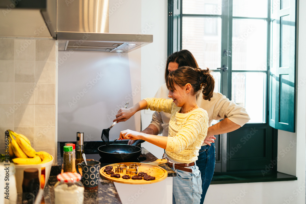 Mom and daughter cooking chocolate cookies together in modern kitchen