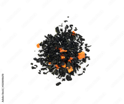 Dry kelp seaweed squares, mini wakame pieces isolated, dried kombu and carrot flakes from ramen