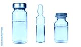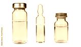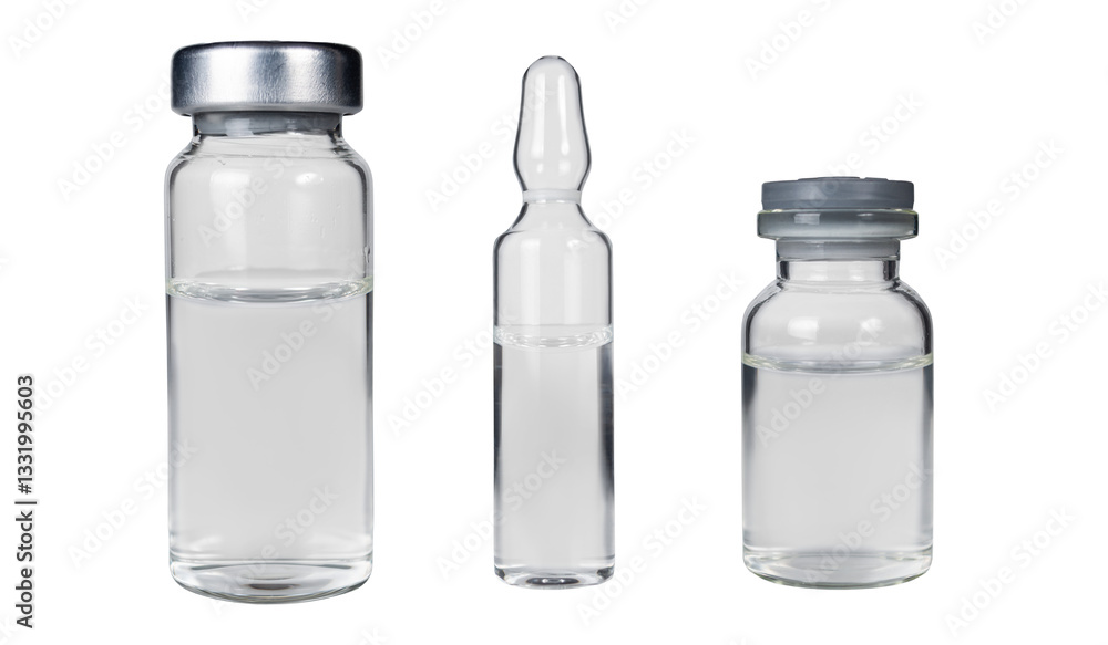 Multiple semitransparent vials containing clear liquid on a clean surface in a laboratory setting