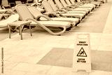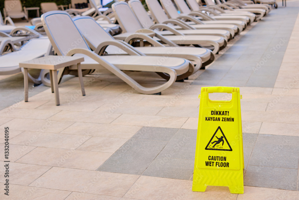 Vibrant caution sign positioned on sunlit pool deck, emphasizing safety precautions in relaxing vacation environment with neatly arranged loungers