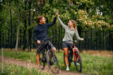 A Joyful Couple Enjoying a Bike Ride Together in Nature While HighFiving Each Other