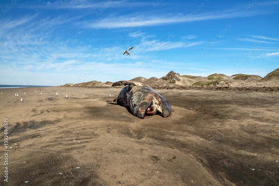 seagulls eating dead Male gray whale on the shore of bahia magdalena baja california sur mexico
