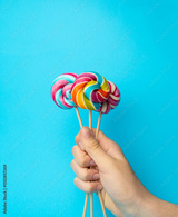 Color lollipop, spiral candy on stick, colorful striped lollypop, round fruit caramel, circle lollipop