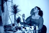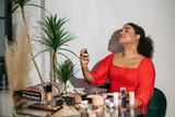 Transgender latin influencer applying perfume while recording makeup tutorial