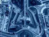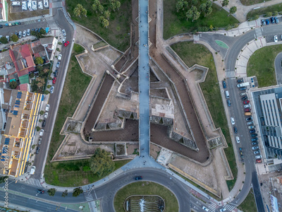 Aerial ground plan view of Badajoz Palmas bridge head horn work, two half-bastions projecting outwards