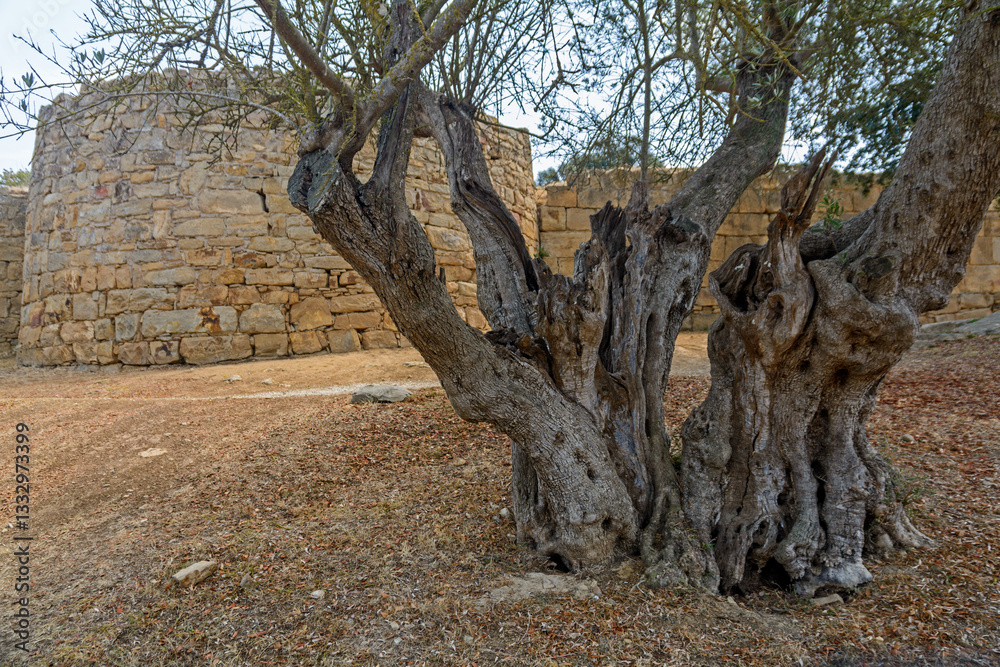 Oil trees and antique ruins of the iberean settlement Puig de Sant Andreu near Ullastret, Spain