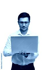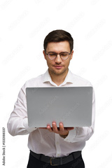 Man in a white shirt and glasses using a laptop with focused expression in a bright environment