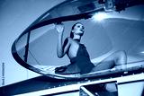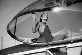 fashion pilot girl in a red dress sitting a cabin of propeller plane on the sunset