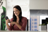 Positive satisfied business leader woman using smartphone for job communication, chatting online with colleagues, partners, browsing Internet, social media