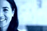 Half face portrait of happy beautiful Latin business woman looking at camera, smiling. Close up cropped shot with copy space. Hispanic female model promoting facial beauty care