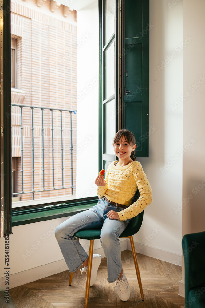 Smiling girl eating strawberry while sitting on chair near window