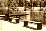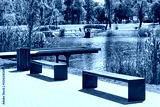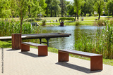 Rest area with wooden Observation deck on the river embankment in Kyiv, Europe. Place to rest in the city park