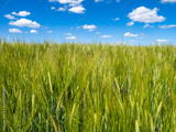 lush green wheat field stretches under a bright blue sky with fluffy white clouds, symbolizing agriculture, growth, and nature