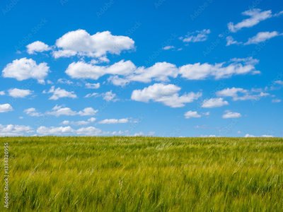 vast green wheat field under a bright blue sky with scattered white clouds, evoking a sense of tranquility, nature, and agricultural abundance