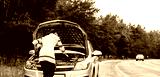 young woman standing near the broken car. The girl opened the hood and look at the engine. Refit woman car