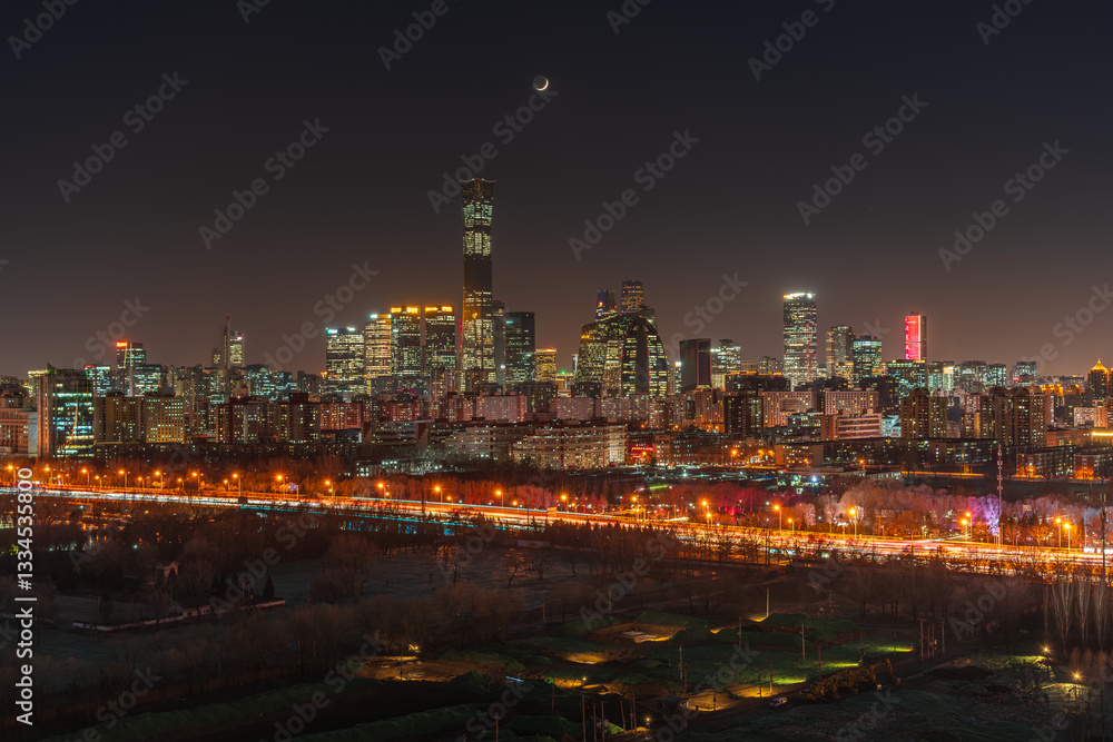 The night scene of China World Trade Center in Beijing, China. Skyscrapers and the flow of vehicles in a prosperous metropolis