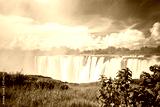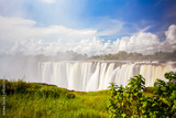 Victoria falls through through the mist and spray. Blue sky and green grass in the foreground.