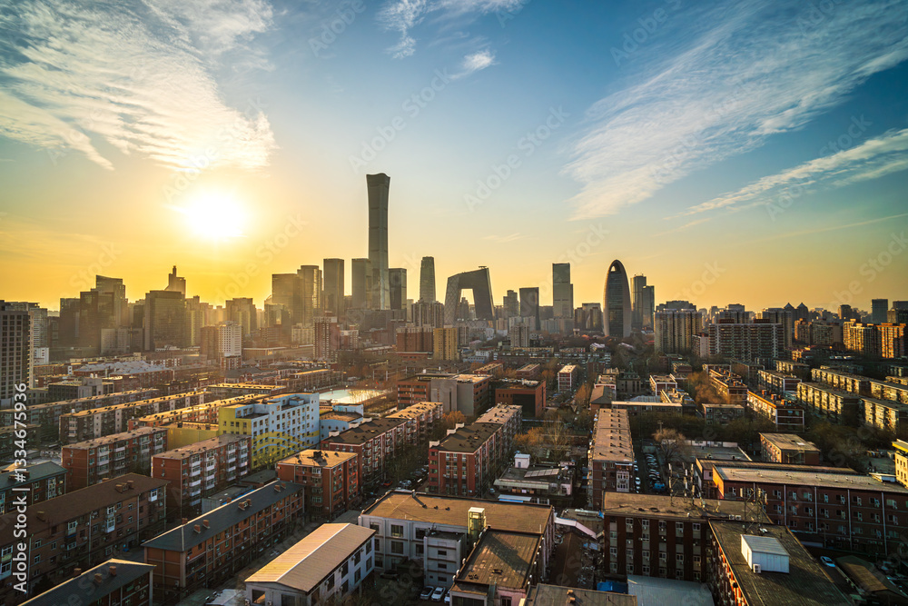 The urban skyline of China under the setting sun, the building complex of China World Trade Center in Beijing