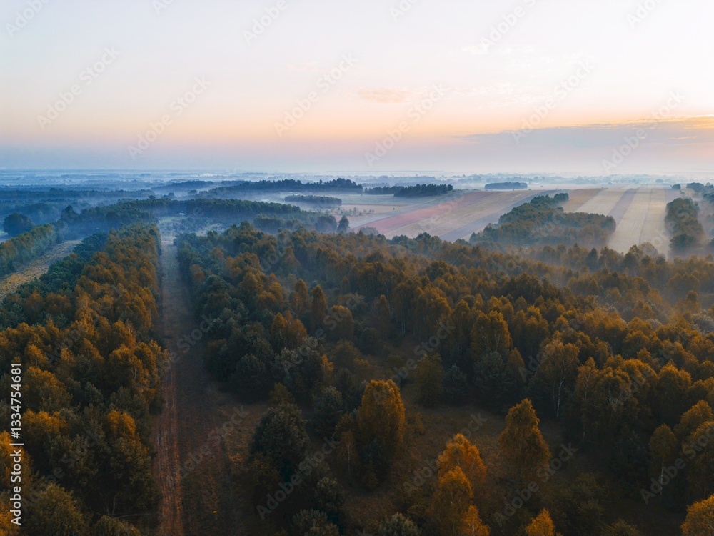Morning mist and sunlight over green countryside