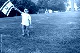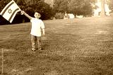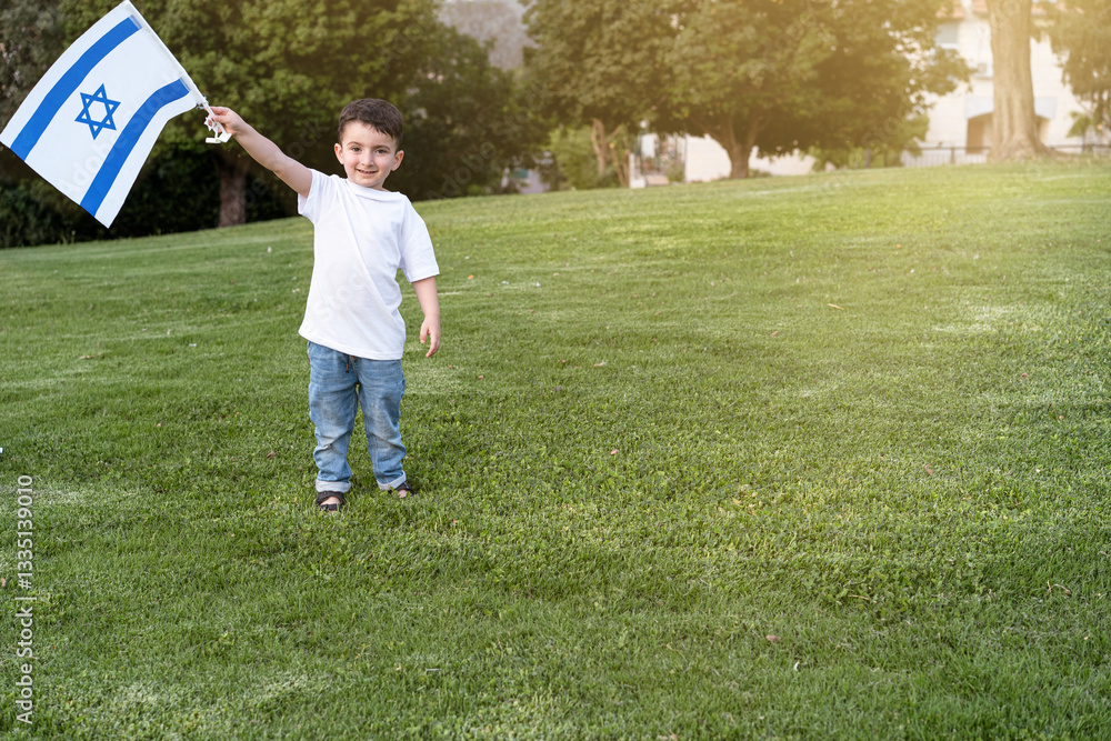 A young child stands on lush green grass, waving the Israeli flag with excitement. The sun shines brightly, creating a warm and cheerful atmosphere in the park.