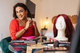 Transgender influencer braiding hair, preparing for makeup tutorial