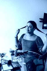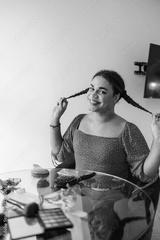 Transgender latin influencer applying makeup and styling hair