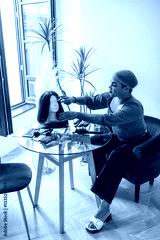 Transgender influencer arranging red wig on mannequin head for makeup tutorial