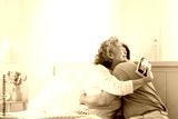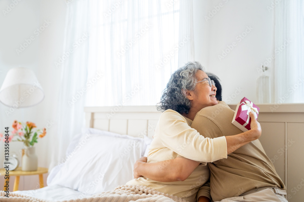 Happy Asian family adult son give present in gift box to senior mother on the bed in bedroom. Elderly mother celebration birthday party or mother's day with son at home. Family relationship concept.
