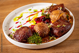 Savor the exquisite arrangement of tender beef paired with colorful sauces and fresh herbs
