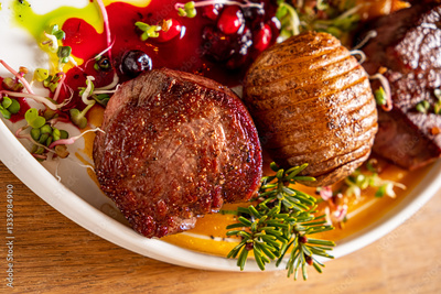 A delightful plate showcasing tender cuts of meat, colorful garnishes, and artistic presentation