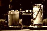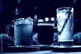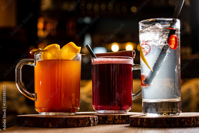 Three delightful drinks on wooden coasters invite a relaxing, flavorful experience