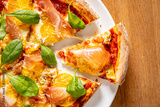 Delighting in a flavorful pizza adorned with thin slices of meat and vibrant greens