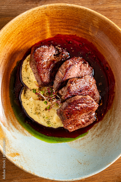 Savory beef medallions rest on creamy puree, drizzled with rich sauce and garnished elegantly